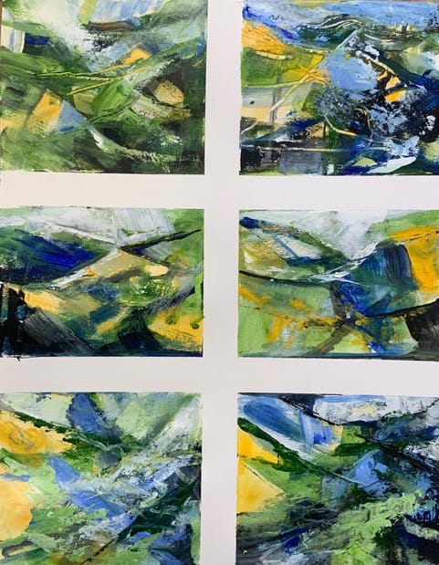 We started with an exercise. We divided a large page into six squares and looking at a photo of a landscape we found the big shapes which we drew with a black marker pen. Next we used one of these drawings and using a big brush and a very restricted palette of just two colours, yellow and blue plus paynes grey and white we painted another page of six small abstracts. Big bold brush marks was our aim!